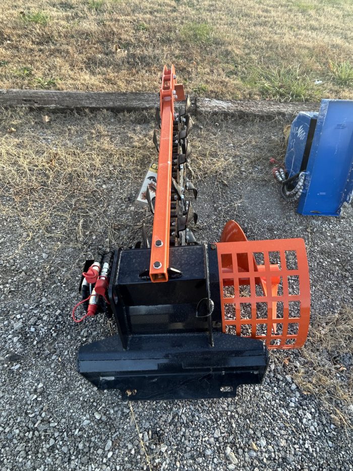 The GIYI GY-X380 is a hydraulic trencher attachment designed for mini skid steer loaders. It has a 39″ boom, and cuts a trench 8″ wide, with a maximum depth around 950 mm.