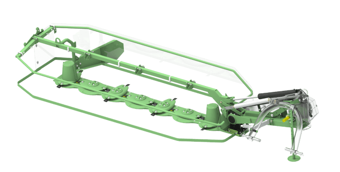 A rear-mounted, lightweight disc mower built by SaMASZ for smaller farms and mid-sized tractors. It features a SwiftCUT cutterbar with quick knife exchange, the SafeGEAR disc protection system, stepless cutting height adjustment, and high ground-following capability for use on uneven terrain.