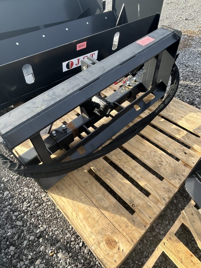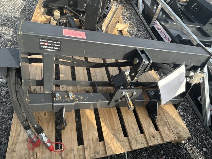 A heavy-duty 3-point hitch adapter designed to let you operate standard agricultural implements and attachments from a skid steer loader that features a quick-attach design for easy mounting and is compatible with skid steers that have auxiliary hydraulics.