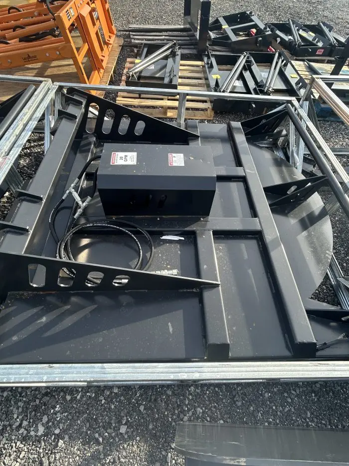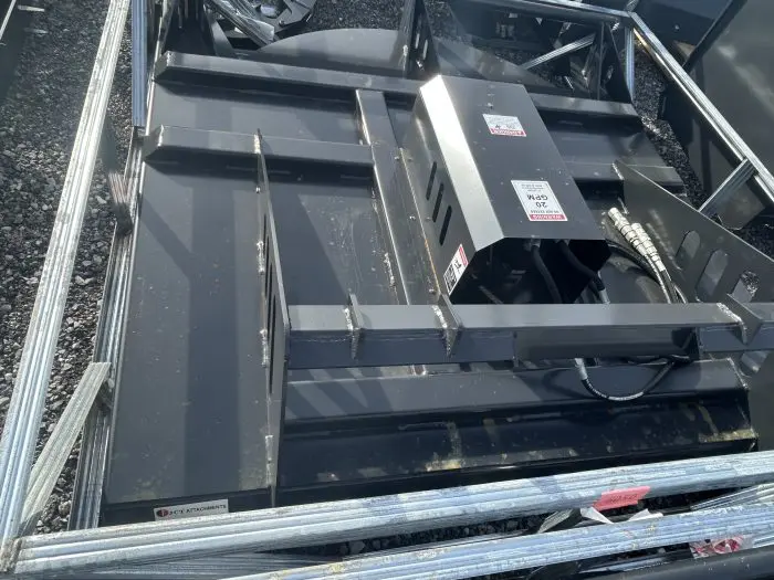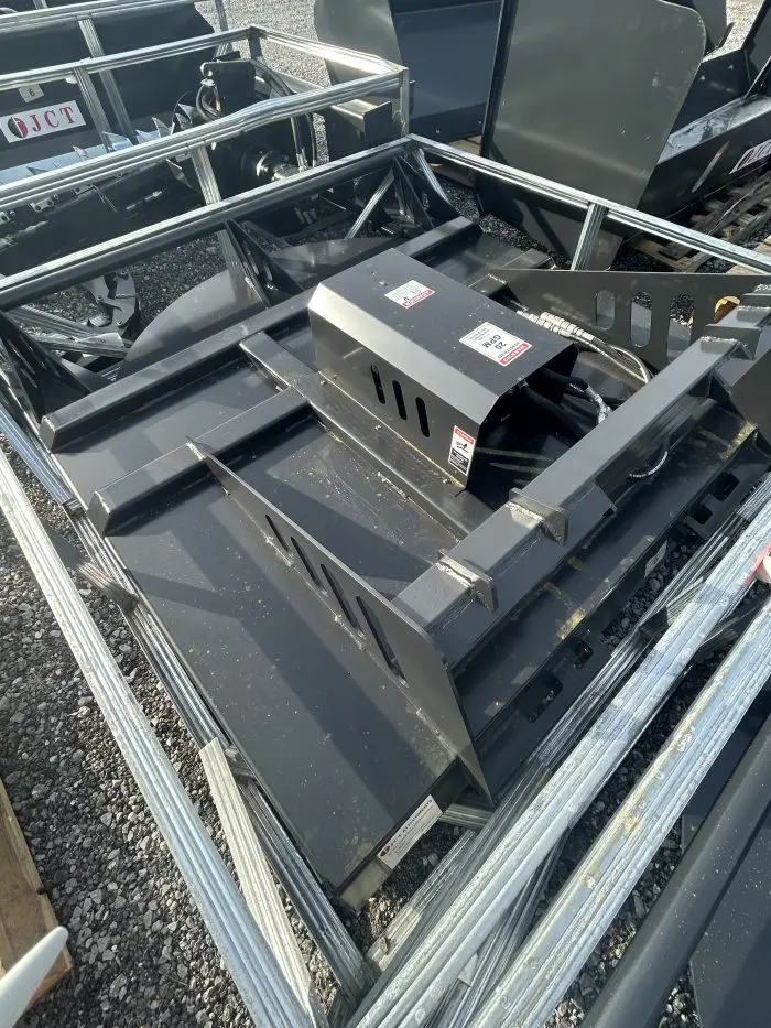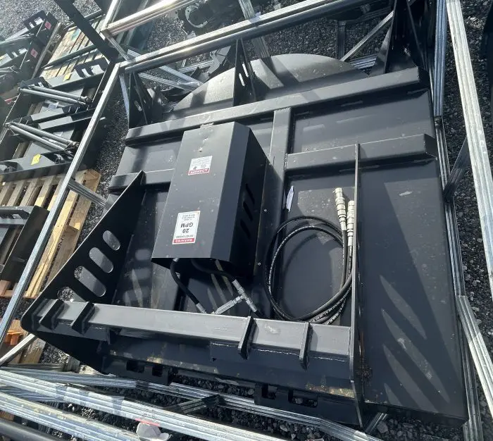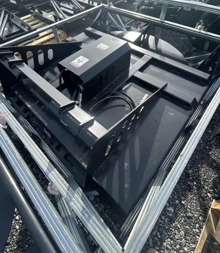 Skid Steer Brush Cutter is a heavy-duty skid steer attachment designed for clearing thick brush, overgrown vegetation, and light saplings. Built with a rugged 7-gauge steel deck and twin reinforced blades, it mounts quickly to most skid steer loaders via a universal quick-attach plate and runs off the machine’s auxiliary hydraulics. The direct-drive hydraulic motor and gearbox deliver efficient, high-speed blade rotation, while features like a stump jumper and rear safety chain help protect the cutter and improve performance in tough terrain.